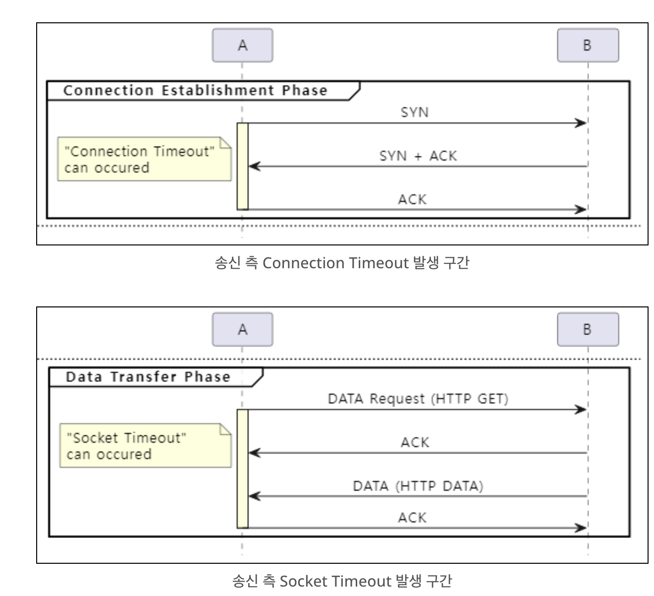 - Socket Timeout : ์ฐ๊ฒฐ์ ์ฑ๊ณตํ์ผ๋ ๋ฐ์ดํฐ๋ฅผ ์ฃผ๊ณ ๋ฐ์ ๋ ๊ฐ๋ณ ํจํท ์๋ต์๊ฐ์ ์ด๊ณผํ ๊ฒฝ์ฐ