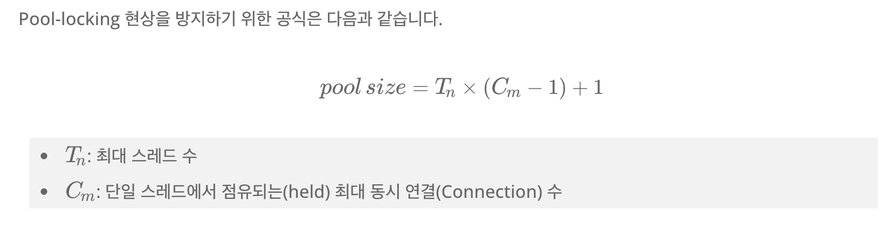 connection pool size์ ๊ฒฝ์ฐ ์๋ฒ์ ์ต๋ ์ค๋ ๋ ์๋ฅผ ์ ์ ํ๊ฒ ์ง์ ํด์ฃผ์ด์ผ ํฉ๋๋ค. ์๋๋ฉด Pool Locking ์ผ๋ก HikariCP ์์ฒด ๋ฐ๋๋ฝ์ด ๋ฐ์ํ ์ ์์ต๋๋ค. ๋คํํ๋ ์ด๋ ์ ์๋ ค์ง ์ด์๋ผ์ ์๋ ๊ณต์์ ๋ฐ๋ผ ๊ฐ์๋ฅผ ์ง์ ํด์ฃผ๋ฉด ์์ ํฉ๋๋ค.