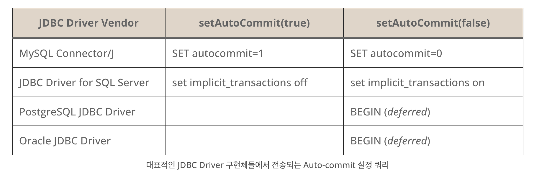 ์ด ๋ ํ๊ฐ์ง ์ ์ํด์ผํ ์ ์, setAutoCommit์ ๋ฐ๊ฟ ๋ JDBC ๋ด๋ถ์๋ง ๋-๋ฑ ์ ์ฉ๋๋๊ฒ ์๋๋ผ DBMS์ ์ฟผ๋ฆฌ๋ก ์์ฒญํด์ผํ๋ค๋ ์ ์ ๋๋ค. ์ด๋ฅผ ๋ฌด์๋ฏธํ๊ฒ ๊ณ์ ๋ณ๊ฒฝํ๋ค๋ฉด ํ์ ์ด์์ ํธ๋ํฝ๊ณผ DB ๋ถํ๊ฐ ๋ฐ์๋ ์ ์์ต๋๋ค. ๋ฌผ๋ก ์คํ๋ง์ ์ด๋ค๋ฉด DataSourceTranscationManager ์์ ์ด๋ฏธ ์ต์ ํ ๋์ด์๊ณ HikariDataSource ์์๋ autoCommit์ ๊ด๋ฆฌํด์ฃผ๊ธฐ ๋๋ฌธ์ ๊ฐ๋ฐ์๊ฐ ์ ๊ฒฝ ์ธ ์ผ์ ์๊ธดํฉ๋๋ค.
