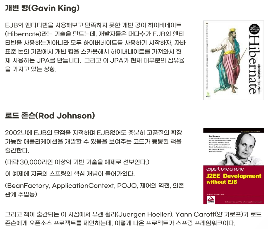 ๋ค๋ฅธ ํํธ์ผ๋ก๋ 2003๋ ์ ๋น์ ์์ฒญ ์ ๋ช ํ๋ ์๋ฐ ์ํฐํ๋ผ์ด์ฆ ๊ฐ๋ฐ์๋ค(์ ๊ฒ ํ ๋ก, ์ ์นด๋กํ)์ด ๋กญ ์กด์จ์ ์์ ํ์ฌ ์ฑ ์ ์ฃผ์ ๊ฐ๋ ์ ๊ทธ๋๋ก ์ ์ฉํ ์๋ฐ ์คํ์์ค ํ๋ ์์ํฌ๋ฅผ ๋ง๋ค์๊ณ ์ ์ํ์๋๋ฐ, ์ด๊ฒ์ด ๋ฐ๋ก Spring Framework ์ ์์ด์๋ค. ๊ทธ ๋น์ ์คํ์์ค ํ๋ ์์ํฌ๋ ์๋นํ ํ์ ์ ์๋๋ฐ, ์์ํ ์คํ ์์ค๋ก ์ด์ํ๋ค๋ณด๋ ๊ด๋ฆฌ๊ฐ ์ด๋ ค์ ๊ณ ์์ฌ์ด์ ์ด ๋ง์๊ธฐ์ 2009๋ ์ VMware ํ์ฌ๊ฐ ์คํ๋ง ํ๋ ์์ํฌ๋ฅผ ์ธ์ํ์ฌ ๊ด๋ฆฌํ๊ณ ์๋ค. (๋ผ์ด์ ์ค๋ ๊ทธ๋๋ก Apache License 2.0 ์คํ์์ค๋ฅผ ์ ์งํ์๋ค.)