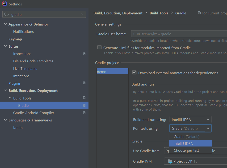 ํธ์ง๊ธฐ ๊ธฐ๋ณธ ์ค์ ์ด ์๋ฐ๋ก ์ง์ ์คํํ๋ ๊ฒ์ด ์๋๋ผ ๊ทธ๋๋ค์ ํตํด์ ์คํ๋๊ฒ ๋๋๋ฐ, ์ด๋ ๊ฒ ๋๋ฉด ๊ฐ๋ฐํ ๋ ์๋ฒ ๋ก๋ฉ ์๋๊ฐ ๋๋ ค ๋ถํธํ๋ค. ์ด๋ Preferences(๋๋ File-Setting) - gradle ์ ๋ค์ด๊ฐ์ Bulid and run using์ต์ ์ ๋ค์๊ณผ ๊ฐ์ด ๋ฐ๊ฟ์ฃผ๋ฉด ๋น ๋ฅด๊ฒ ๊ทธ๋๋ค์ ๊ฑฐ์น์ง ์๊ณ ์๋ฐ๋ฅผ ๋ฐ๋ก ์คํํด์ ๋น ๋ฅด๊ฒ ํ ์คํธํด๋ณผ ์ ์๋ค.