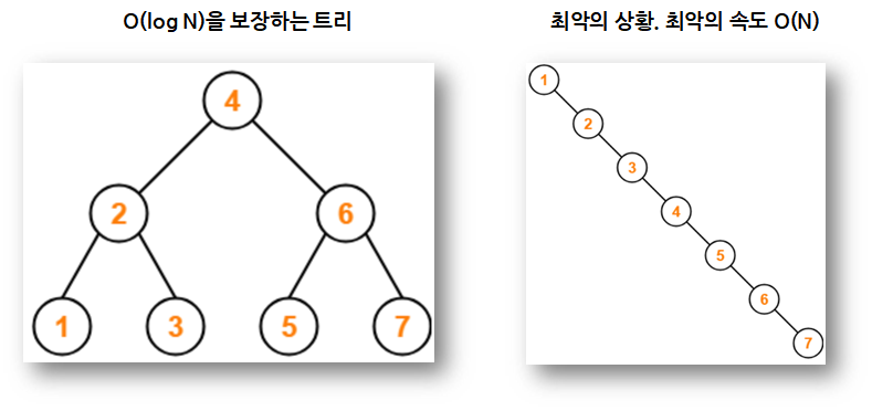 - ํธ๋ฆฌ์ ๋ ธ๋๊ฐ ํ ๋ฐฉํฅ์ผ๋ก ์ ๋ฆฌ์ง ์๋๋ก, ๋ ธ๋ ์ฝ์ ๋ฐ ์ญ์ ์ ํน์ ๊ท์น์ ๋ง๊ฒ ์ฌ ์ ๋ ฌ๋์ด ์ผ์ชฝ๊ณผ ์ค๋ฅธ์ชฝ ์์ ์์ชฝ ์์ ๋ฐธ๋ฐ์ค๋ฅผ ์ ์งํ๋ ํธ๋ฆฌ์ด๋ค. ํญ์ ์์ชฝ ์์์ ๋ฐธ๋ฐ์ค๋ฅผ ์ ์งํ๋ฏ๋ก, ํธ๋ฆฌ์ ํ๊ท ์๊ฐ๋ณต์ก๋ O(logN)์ ํญ์ ๋ณด์ฅํ๋ค.