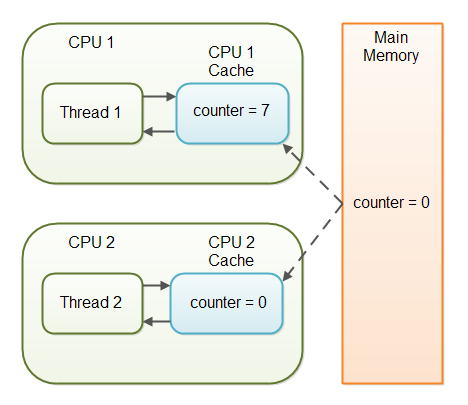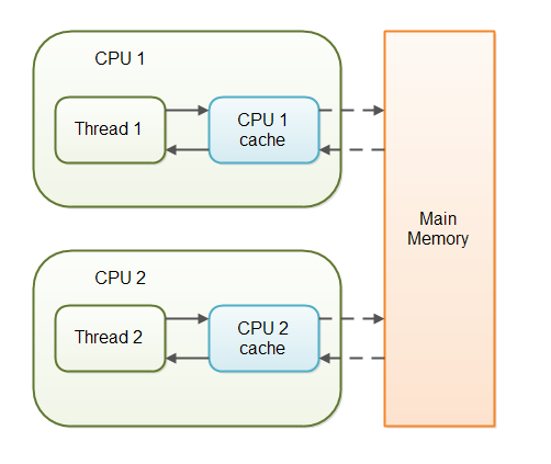 ์ด๋ ๊ฒ ์ผ๋ฐ ๋ณ์(non-volatile)์ ๋ํ ์์ ์ JVM์ด ๋ฉ์ธ ๋ฉ๋ชจ๋ฆฌ๋ก๋ถํฐ CPU ์บ์๋ฅผ ํตํด ๋ณ์๋ฅผ ์ฝ๊ฑฐ๋ ๋ฐ๋๋ก CPU ์บ์๋ก ๋ถํฐ ๋ฉ์ธ ๋ฉ๋ชจ๋ฆฌ์ ๋ฐ์ดํฐ๋ฅผ ์ฐ๊ฑฐ๋ ํ ๋ ์ด๋ ํ ๋๊ธฐํ ๋ณด์ฅ๋ ํด์ฃผ์ง ์๋๋ค.