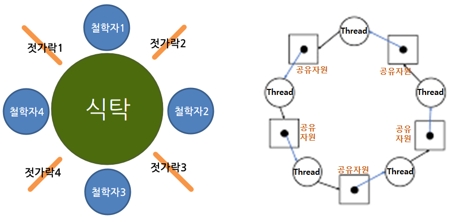 ์ ๊ฐ๋ฝ์ด ๊ณต์ ๋๋ ๋ฉ๋ชจ๋ฆฌ, ์ ๊ฐ๋ฝ ์์ชฝ์ ์์์๋ ์ฌ๋์ ํด๋น ๋ฉ๋ชจ๋ฆฌ๋ฅผ ์ฌ์ฉํ๋ ์ฐ๋ ๋์ด๋ค. ์ค์ ๋ก ์์คํ ์์์ ์ด๋ฐ ์์ผ๋ก ๊ณต์ ์์์ด ์ฎ์ด์์ ์ ์๋ค. ์ด ๊ฒฝ์ฐ ๊ต์ฐฉ์ํ์ ๋น ์ง ๋ฐ๋๋ฝ์ด ์๊ธธ ์๋ ์๊ณ ํน์ ์ฐ๋ ๋(์ฌ๋)์ ์์ํ ์์์ ํ ๋น๋ฐ์ง ๋ชปํด ๊ตถ์ด์ฃฝ๋(Starvation) ๋ฌธ์ ๊ฐ ์์ ์ ์๋ค.