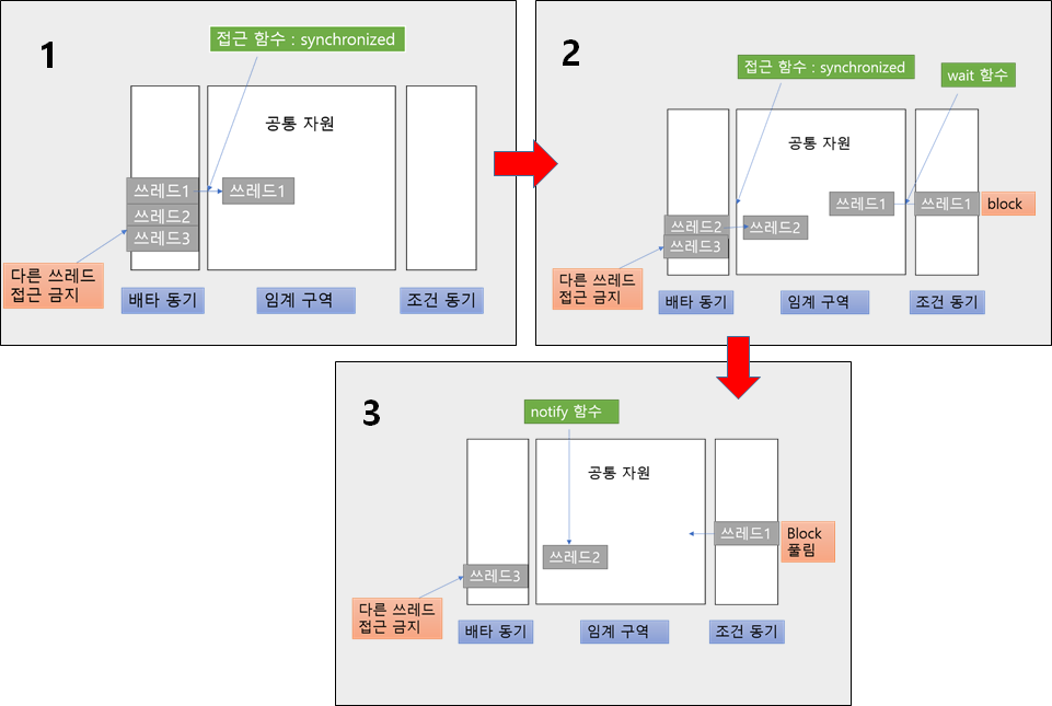 - ์๊ณ์์ญ์ ์ ๊ทผํ์์ผ๋ I/O๋ฑ์ผ๋ก ์์ง ๋ฐ์ดํฐ๊ฐ ์ค๋น๋์ง ์์ ํด๋น ์ฐ๋ ๋๊ฐ ๊ธฐ๋ค๋ ค์ผ ํ๋ ๊ฒฝ์ฐ wait()์ผ๋ก ์ค๋ฅธ์ชฝ ํ์ ๋ค์ด๊ฐ ์ ์์ต๋๋ค. ์ด๋ ์ฐ๋ ๋๋ฅผ ์ข ๋ฃํ๋๊ฒ ์๋๋ผ ์ ์ ๊ธฐ๋ค๋ฆฌ๊ฒ(block)ํ๋ ๊ฐ๋ ์ ๋๋ค.