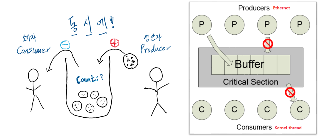 ๋ค๋ฅธ๋ง๋ก ์ ํํ ๋ฒํผ ๋ฌธ์ (Bounded Buffer Problem)๋ผ๊ณ ๋ ํ๋ค. ์ถ๊ธ๊ณผ ์ ๊ธ, ์ ์๊ณผ ์ฌ์ฉ์ฒ๋ผ ์์ฐ์๊ฐ ๋ฐ์ดํฐ๋ฅผ ์์ฐํ๋ฉด ์๋น์๊ฐ ๊ทธ๊ฒ์ ์๋นํ๋ ๊ตฌ์กฐ์์ ์ ์ฅ๊ณต๊ฐ์ธ buffer๊ฐ ๋ฌดํํ์ง ์์ ๋ ์๊ธฐ๋ ๋ฌธ์ ์ด๋ค.