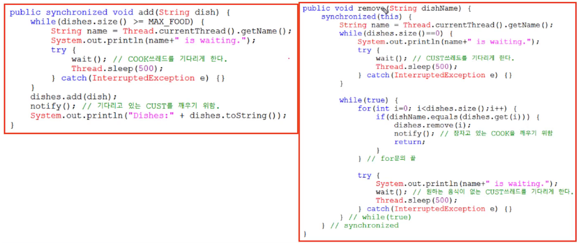 ์ฆ wait()์ด ๋ฒํผ๊ฐ ๊ฐ๋์ฐจ์ ์๋น์๋ฅผ ์ํด ์๋ํ๊ฑด์ง ์๋๋ฉด ์์ ๋ฌธ์ ์ฒ๋ผ ์์ฐ์๋ฅผ ๊ธฐ๋ค๋ฆด๋ ค๊ณ wait์ ํ๊ฑด์ง ์ ์ ์๊ณ , ์ด๋์์ ์ notify()๋ฅผ ๊ฑธ์ด ๋ค์ ๋์์์ผ์ผ ํ๋์ง๋ ์๋นํ ์ ๋งคํด์ง๋ค.