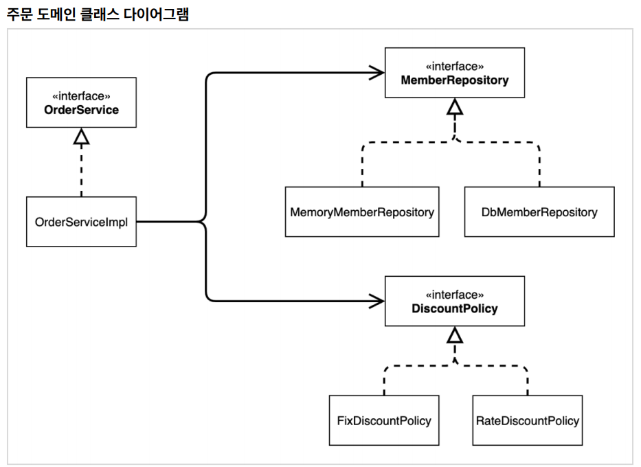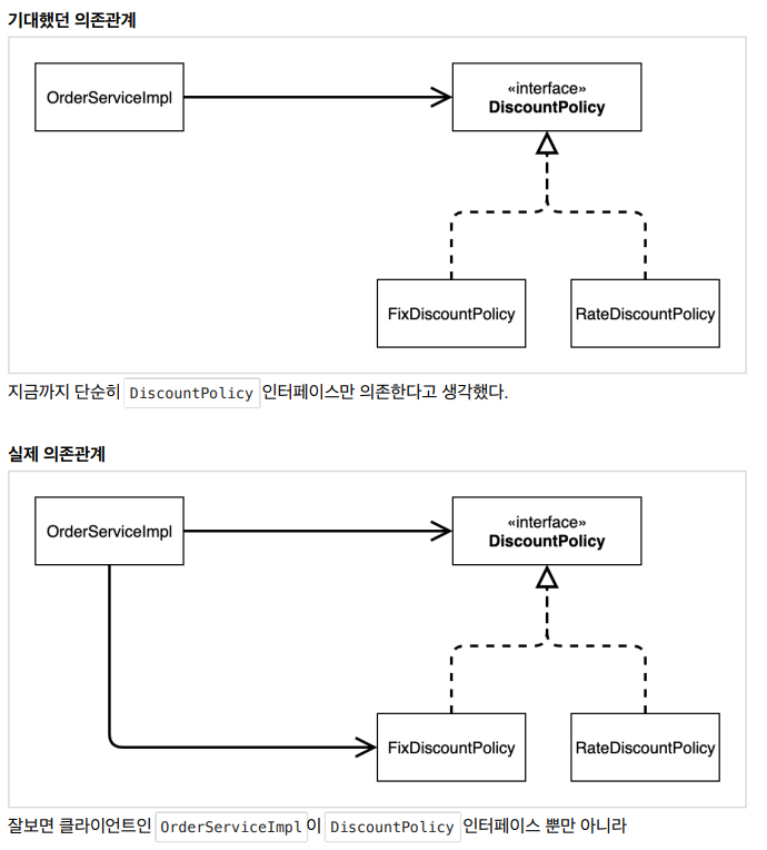 -> ๊ทธ๋ ๊ฒ ๋ณด์ด์ง๋ง ์ฌ์ค์ ์๋๋ค. - DIP: ์์กด์ฑ. ์ฃผ๋ฌธ ํด๋ผ๋( OrderServiceImpl )๋ DiscountPolicy ์ธํฐํ์ด์ค๋ง ์์กดํ๋ ์งํจ๊ฑฐ ์๋๊ฐ?