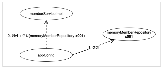 - ( MemberServiceImpl, MemoryMemberRepository, OrderServiceImpl, FixDiscountPolicy ) - AppConfig๋ ์์ฑํ ๊ฐ์ฒด์ ์ธ์คํด์ค์ ์ฐธ์กฐ๋ฅผ ์์ฑ์๋ฅผ ํตํด์ ์ฃผ์