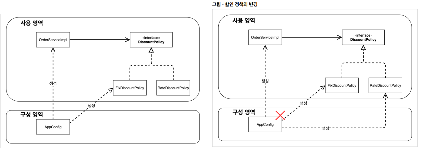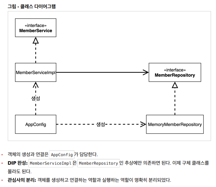 ์ฒ์์ ์ค๊ณ์์๋ ๊ฐ๊ฐ์ ๊ตฌํ์ฒด๋ค์ด ํ์ํ ๋ค๋ฅธ ์ญํ ์ '์ง์ ๋์ 'ํด์ผ ํ์๋ค. ์ฆ ๋ค๋ฅธ ๊ตฌํ์ฒด์ ์์กด์ฑ์ด ์๊ธฐ๋ฉฐ DIP ์์น์ ์งํค์ง ๋ชปํ๋ค. ํ์ง๋ง AppConfig๋ฅผ ํ ์ธ์ ์ฑ ์ด๋ ํ์์กฐํ์ ์ฅ์๊ฐ ์์ฑ์๋ฅผ ํตํด AppConfig์์ ์ฃผ์ ํ๋๋ก ๋ฐ๊พธ๋ฉด์ ์ด์ ํด๋ผ์ด์ธํธ ๊ฐ์ฒด๋ ๋ค๋ฅธ ๊ตฌํ์ฒด๋ฅผ ์ ํ ๋ชฐ๋ผ๋ ์ธํฐํ์ด์ค(์ถ์ํ)์ ์์กดํ์ฌ ์ฝ๋๋ฅผ ์์ฑํ ์ ์๊ฒ ๋์๋ค.