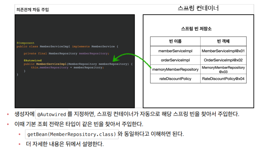 @Autowired์ ์๋ฆฌ๋ ์คํ๋ง ์ปจํ ์ด๋๊ฐ [๋ฑ๋ก๋ ์คํ๋ง ๋น]์ค์์ ํ์ ์ด ๊ฐ์ ๋น์ ์ฐพ์ ์์กด๊ด๊ณ๋ฅผ ์ฃผ์ ํ๋ค. ๊ธฐ๋ณธ ๋์์ ๊ฐ์ ํ์ ์ ๋น์ ์กฐํํ๋ getBean(MemberRepositoryt.class) ๋ฉ์๋๋ฅผ ์ฌ์ฉํ์ฌ memoryMemberRepository๋ฅผ ์ฐพ์ ๋ฑ๋กํด์ฃผ๋ ๋ฐฉ์์ด๋ผ๊ณ ์๊ฐํ๋ฉด ๋๋ค.