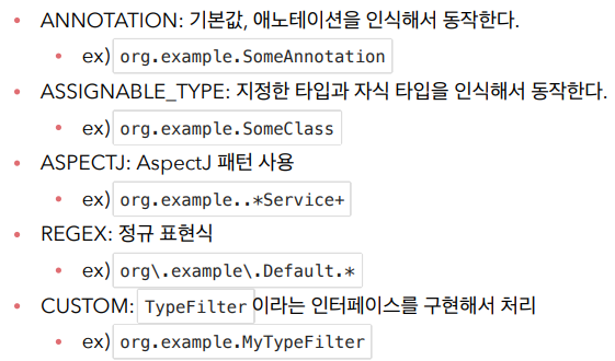 - excludeFilters : ์ปดํฌ๋ํธ ์ค์บ์์ ์ ์ธํ ๋์์ ์ง์ ํ๋ค.