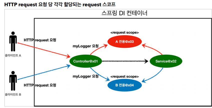 - request : HTTP ์์ฒญ ํ๋๊ฐ ๋ค์ด์ค๊ณ ๋๊ฐ ๋ ๊น์ง ์ ์ง๋๋ ์ค์ฝํ, ๊ฐ๊ฐ์ 'HTTP ์์ฒญ๋ง๋ค' ๋ณ๋์ ๋น