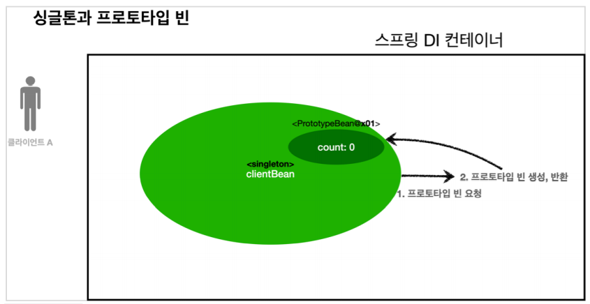 ๋ง์ฝ ์ฑ๊ธํค ๋น(clientBean)์ด ์์กด๊ด๊ณ ์ฃผ์ ์ ํตํด์ ํ๋กํ ํ์ ๋น(PrototypeBean)์ ์ฃผ์ ๋ฐ์ผ๋ฉด ์ด๋ป๊ฒ ๋ ๊น?