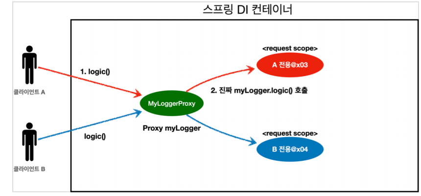 - ํ๋ก์ ๊ฐ์ฒด ๋๋ถ์ ํด๋ผ์ด์ธํธ๋ ๋ง์น ์ฑ๊ธํค ๋น์ ์ฌ์ฉํ๋ฏ requset scope๋ฅผ ์ด์ฉํ ์ ์๋ค.