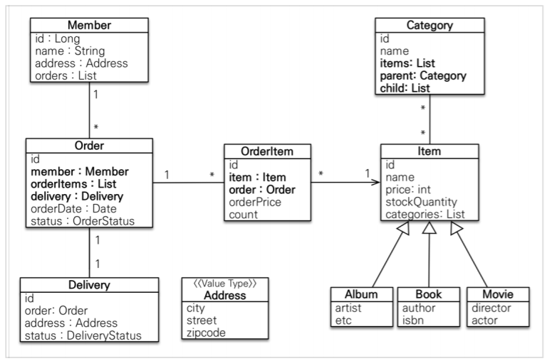 - ํ์(Member): ๊ณ ์ ๊ฐ(id), ์ด๋ฆ(name), ์ฃผ์(Address), ์ฃผ๋ฌธ ๋ฆฌ์คํธ(orders)๋ฅผ ๊ฐ์ง๋ค.