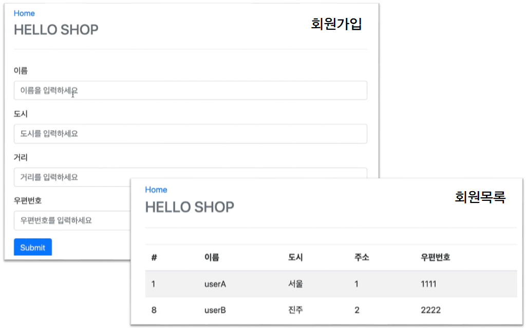 - ์ฃผ์(Address): ๊ฐํ์ (=์๋ฒ ๋๋ ํ์ )์ด๋ค. ๋์(city), ๋๋ก๋ช (street), ์ฐํธ๋ฒํธ(zipcode)๋ฅผ ๊ฐ์ง๋ค.