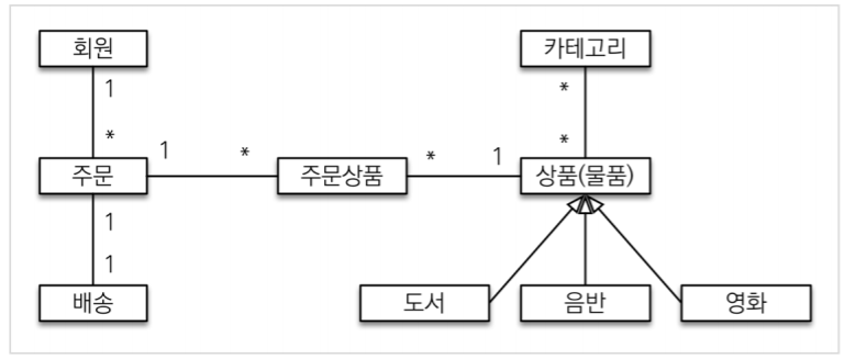 - ํ์์ ์ฌ๋ฌ ์ํ์ ์ฃผ๋ฌธ ํ ์ ์๋ค. ํ๋ฒ ์ฃผ๋ฌธํ ๋ ์ฌ๋ฌ ์ํ์ ์ ํํ ์ ์๋ค. [ํ์<->์ฃผ๋ฌธ<->์ํ]์ด N:N ๊ด๊ณ์ด๋ฏ๋ก, ์ค๊ฐ์ '์ฃผ๋ฌธ ์ํ'์ด๋ผ๋ ์ํฐํฐ๋ฅผ ์ถ๊ฐํ์ฌ 1:N ๊ด๊ณ๋ก ๋ฐ๊ฟ์ฃผ์.