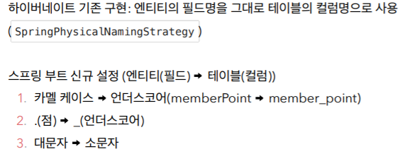 ์คํ๋ง๋ถํธ๋ฅผ ์ฌ์ฉํ๋ฉด ํ์ด๋ฒ๋ค์ดํธ ๊ธฐ๋ณธ ๋งคํ์ ๋ต์ด ๋ณ๊ฒฝ๋๋ค. ์ฆ ์ค์ ํ ์ด๋ธ ํ๋๋ช ์ด ๋ค๋ฅด๋ค. ( ํ์ด๋ฒ๋ค์ดํธ๋ง ์ฌ์ฉํ๋ฉด ์ํฐํฐ์ ํ๋๋ช ์ ๊ทธ๋๋ก ํ ์ด๋ธ์ ์นผ๋ผ๋ช ์ผ๋ก ์ฌ์ฉํ๋ค.)