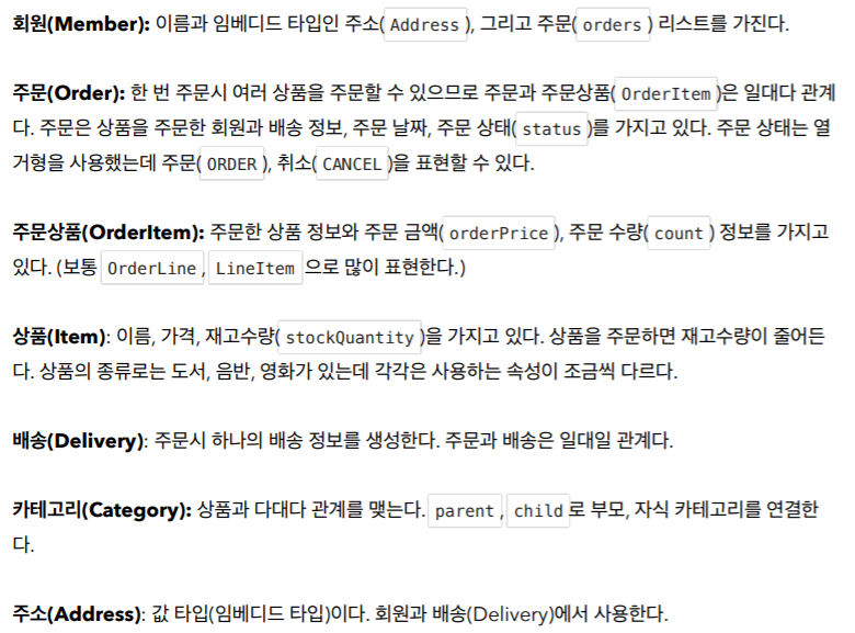 | 1. ๋๋ฉ์ธ | ํ์(Member) ์ํ(Item) ์ฃผ๋ฌธ(Order) |