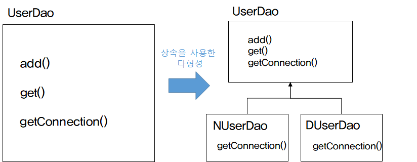 ์ฌ๊ธฐ์ ํ๊ฑธ์ ๋ ๋์๊ฐ ์ฌ์ ์ด ์ปค์ง๋ฉด์ N์ฌ์ D์ฌ์ ์ฌ์ฉ์๊ด๋ฆฌ๋ฅผ ๋์์ ๋งก๊ฒ ๋์๋ค๊ณ ์์ํด๋ณด์. ์ด์ UserDao๋ ๊ฐ ํ์ฌ๋ง๋ค ๋ค๋ฅธ DB๋ฅผ ํตํฉํด์ ์ฌ์ฉํด์ผํ๋ค. ์ด๋ป๊ฒ ํ์ฅํ ์ ์์๊น?