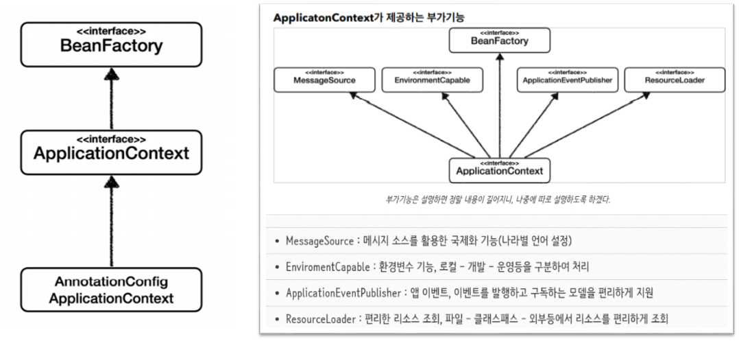 - ์์์ ๋ง๋ค์๋ AppConfig ๊ฐ์ฒด๋ฅผ Object-Container๋ผ๊ณ ๋ถ๋ฅด๋ ๊ฒ ์ฒ๋ผ ์คํ๋ง์ IoC๋ฅผ ๋น๋นํ๋ ํต์ฌ ์ปจํ ์ด๋๋ฅผ ์๋ฏธํ๋ค. ๋ณดํต์ ๋น ํฉํ ๋ฆฌ๋ฅผ ๋ฐ๋ก ์ฌ์ฉํ์ง ์๊ณ ์ด๋ฅผ ์์ก๋ฐ์ App...Context ๊ฐ์ฒด๋ฅผ ์ด์ฉํด์ ์ฌ์ฉํ๋ค. - Application Context(์ฑ ์ปจํ
