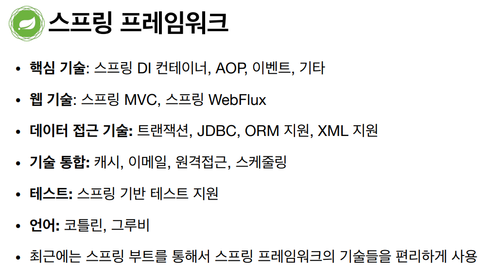 ์คํ๋ง ํ๋ ์์ํฌ๋ IoC ์ปจํ ์ด๋(์ฑ ์ปจํ ์คํธ)๋ฅผ ํฌํจํด์ ์คํ๋ง์ด ์ ๊ณตํ๋ ๋ชจ๋ ๊ธฐ๋ฅ์ ํตํ์ด ๋งํ ๋ ์ฃผ๋ก ์ฌ์ฉํ๋ค. ๋ณดํต Spring Core๋ผ ํจ์ ์ฑ์ ๋ง๋๋๋ฐ ์ฌ์ฉํ๋ ํต์ฌ๊ธฐ๋ฅ๋ค (IoC์ปจํ ์ด๋, AOP, ์ด๋ฒคํธ๋ฑ)์ ์๋ฏธํ์ง๋ง ๋ณดํต '์คํ๋ง'์ด๋ผ ํ๋ฉด ์คํ๋ง ์งํ์์ ์ ๊ณตํ๋ ๋ค๋ฅธ ๊ธฐ๋ฅ๋ค์ ํฌํจํ ์๋ฏธ๋ก ๋ง์ด ์ฌ์ฉํ๋ค. ์คํ๋ง ํ๋ ์์ํฌ์์๋ ํ์์ ๋ฐ๋ผ ๊ธฐ์ (๋๊ตฌ)๋ค์ ๊ณจ๋ผ์ ์ฌ์ฉํ ์ ์๋๋ก ์ ๊ณตํด์ค๋ค. ์์ฃผ ์ฌ์ฉํ๋ ํต์ฌ๊ธฐ๋ฅ๋ค ์ด์ธ์๋ ํ์ ์๋น์ค์ ํ์ํ ๊ฑฐ์ ๋ชจ๋ ๋๊ตฌ๋ฅผ ์ ๊ณตํ๋ค.