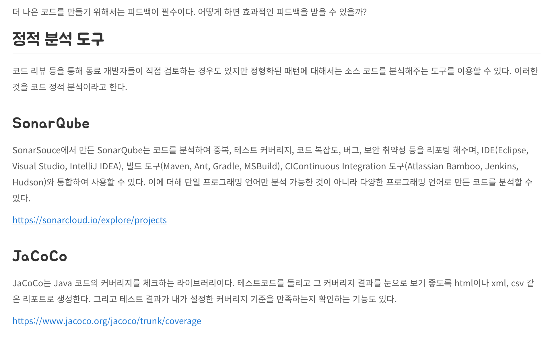 ์ค์ ํ์ ์์๋ ํ ์คํธ ์ฝ๋์ ์ค์์ฑ์ ์ธ์งํ๊ณ , ์ฝ๋ ์ปค๋ฒ๋ฆฌ์ง ๋๊ตฌ๋ฅผ ์ ๊ทน์ ์ผ๋ก ์ฌ์ฉํ๋ค. ๋ํ์ ์ผ๋ก ์๋ํ๋ธ(SonarQube)์ ๊ฐ์ ์ ์ ์ฝ๋ ๋ถ์๋๊ตฌ๋ ์ฝ๋ ์ปค๋ฒ๋ฆฌ์ง๊ฐ์ด ๊ธฐ์กด๋ณด๋ค ๋จ์ด์ง๋ ๊ฒฝ์ฐ ์ปค๋ฐ ์์ฒด๊ฐ ๋ถ๊ฐ๋ฅํ๊ฒ ์ ํํ ์ ์๋ค.