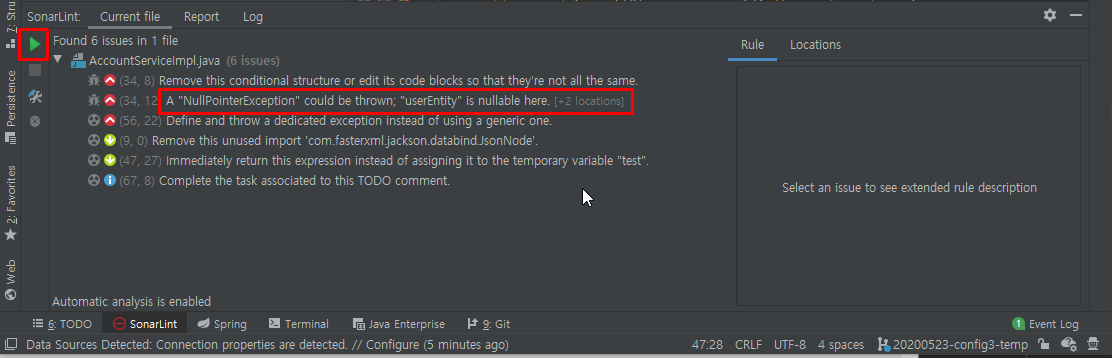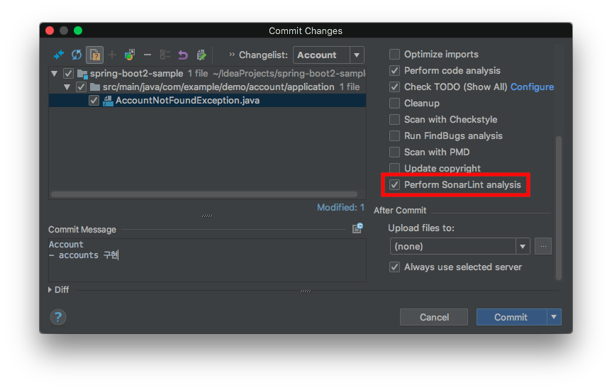 ๊ทธ๋์ ํ๋จ์์ ๊ท๋ชจ์๋ ํ๋ก์ ํธ๊ฐ ์๋๋ผ๋ฉด ์ปค๋ฐ์ ์ SonarLint ๋ถ์ ์ต์ ์ ๋ฃ๋ ๊ฒ๋ง์ผ๋ก๋ ์ถฉ๋ถํฉ๋๋ค.