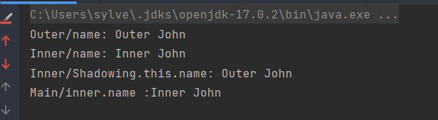 System.out.println("Inner/Shadowing.this.name: " + Shadowing.this.name);