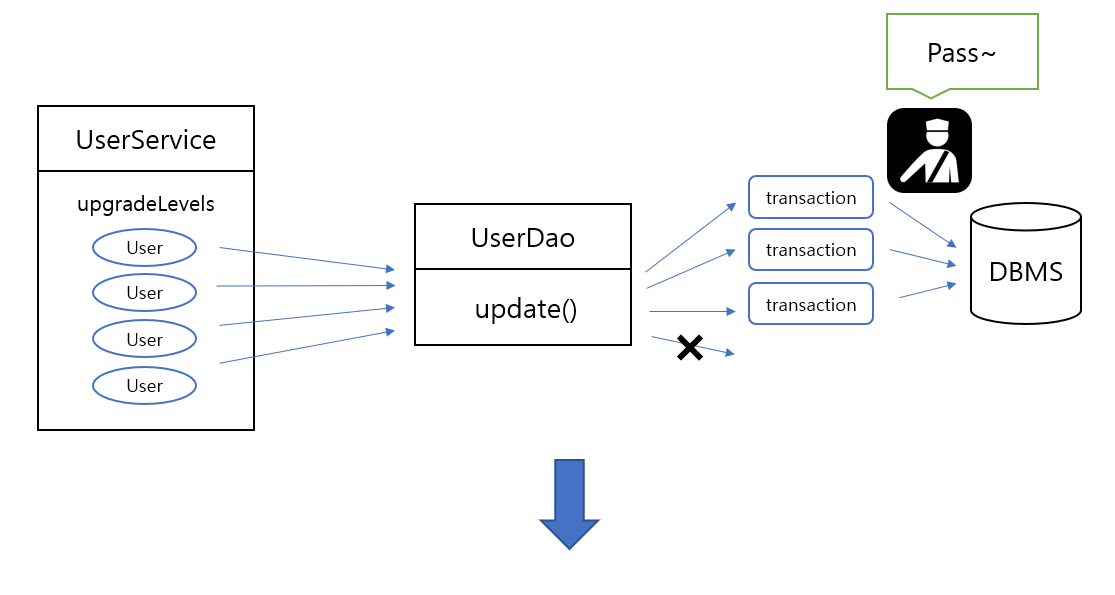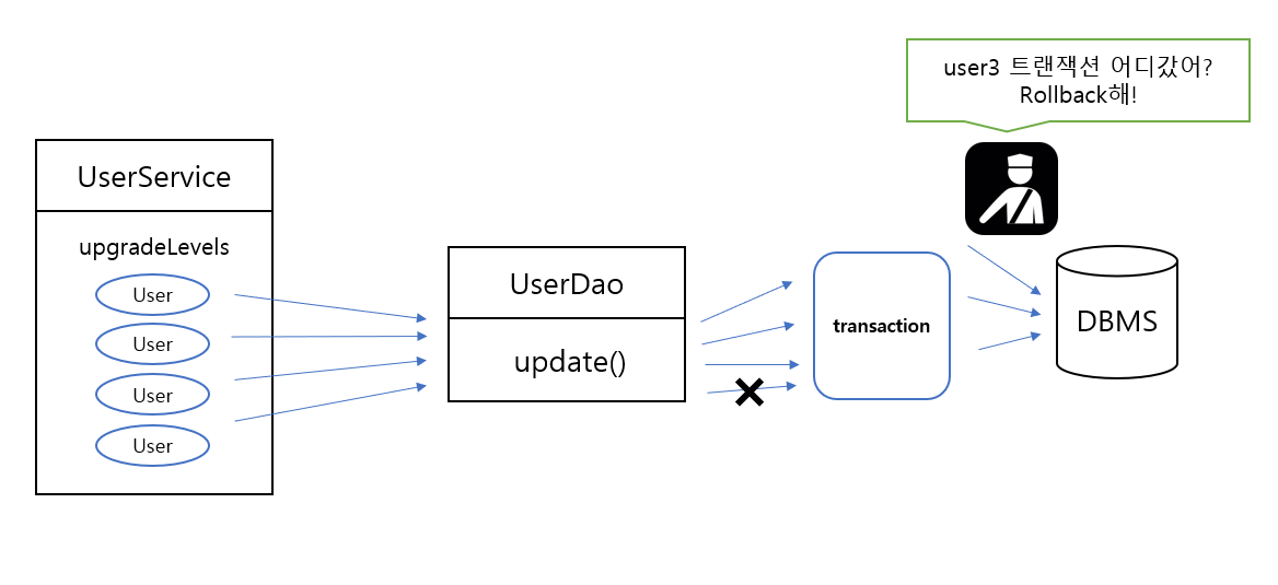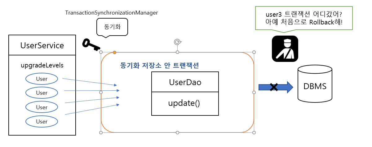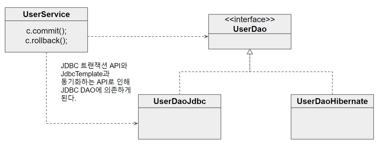 UserService๋ ํธ๋์ญ์ ๋งค๋์ ์ ์ธํฐํ์ด์ค๋ฅผ ์ฌ์ฉํ ๋ฟ, ๋ ์ด์ DAO ๊ฐ์ฒด์ ์์กดํ์ง ์๋๋ค.