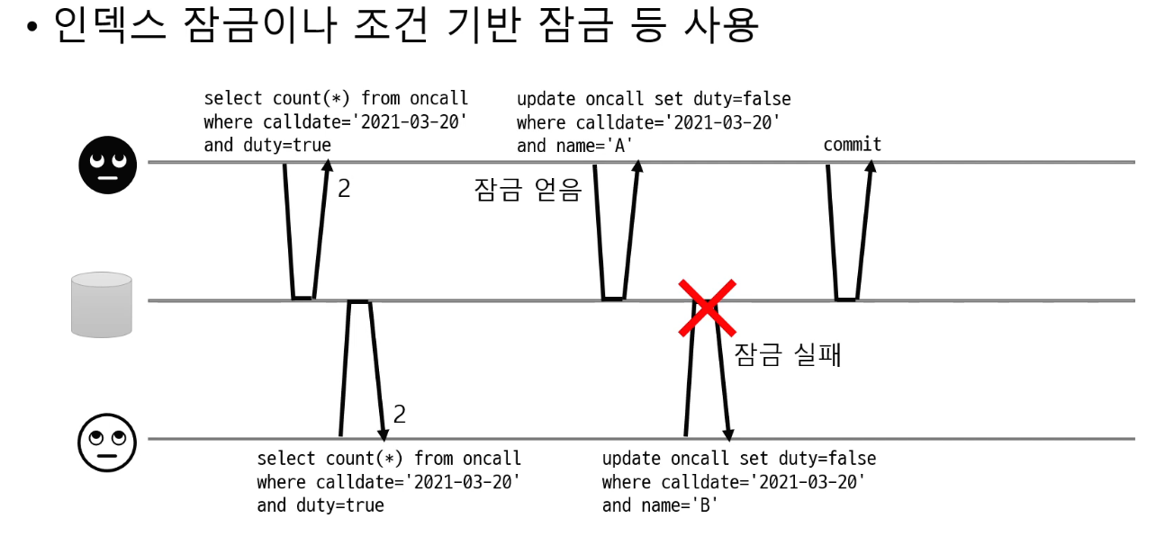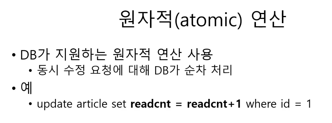 - DB๊ฐ ์ง์ํ๋ ์์์ (atomic) ์ฐ์ฐ๋ง ์ฌ์ฉ