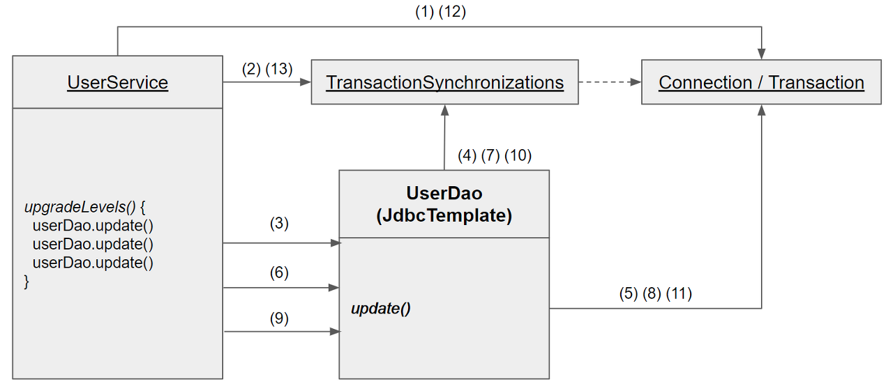 - UserDao.update๋ ์ปค๋ฅ์ ์ ๋ฐ์์์ ์ฌ์ฉ (์ด๋ฏธ ์ฌ์ฉํ๊ณ ์๋ ํธ๋์ญ์ ์ด ์๋ค๋ฉด ๋๊ธฐํํด์ ํจ๊ป ์ฌ์ฉ)