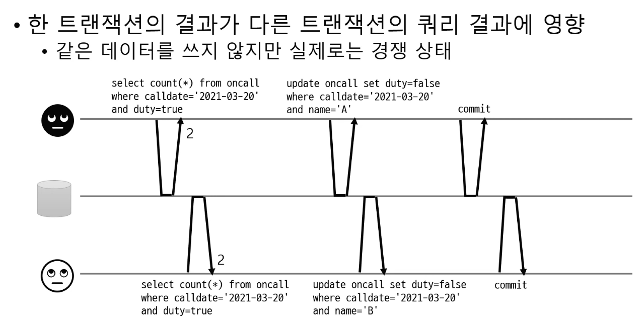 @ ๋ฌธ์ 3: ์ฝ๋ ๋์ ๋ฐ์ดํฐ ๋ณ๊ฒฝ1 (read skew, ์ฝ๋ ์์ ์ ๋ฐ๋ผ ๋ฐ์ดํฐ๊ฐ ๋ฐ๋)