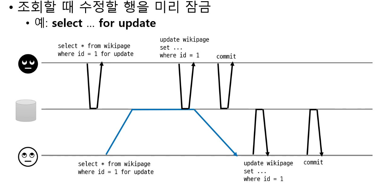 - ํ ๋จ์ ์ ๊ธ ์ฌ์ฉ, ํด๋น ํ์ ์์ ํ๋ ํธ๋์ญ์ ์ด ๋๋ ๋ ๊น์ง ๋๊ธฐ (์ปค๋ฐ ๋ฐ์ดํฐ๋ง ์ฐ๊ธฐ)