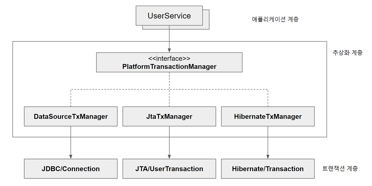 ์ฆ DB์ ๊ทผ ๊ธฐ์ ์ด JTA๋ Hibernate๋ฑ์ผ๋ก ๋ณ๊ฒฝ๋๋ค๊ณ ํด๋ UserService๋ ํธ๋์ญ์ ๋งค๋์ ์ธํฐํ์ด์ค๋ง ์์กดํ๊ณ ์๊ธฐ๋๋ฌธ์ ๋ณ๊ฒฝํ ํ์๊ฐ ์์ด์ง๋ค. ๋จ์ง PlatformTransactionManger ์ธํฐํ์ด์ค์ ์ฃผ์ ํ๋ ๋น๋ง ๋ณ๊ฒฝํ๋ฉด ๋๋ค.
