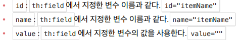 - ์ธํ ํ๊ทธ์ th:filed="..." ๋ฅผ ์ง์ ํด์ฃผ๋ฉด ํ๊ทธ ์์ฑ id, name, value๊ฐ ์๋ ์์ฑ๋๋ค.