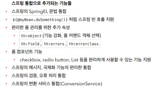 - ์คํ๋ง ํตํฉ ๋ฉ๋ด์ผ: https://www.thymeleaf.org/doc/tutorials/3.0/thymeleafspring.html
