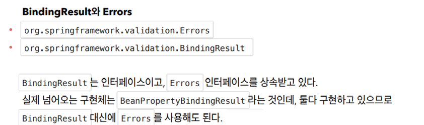 - ๊ธฐ์กด์ errors ๋์ ์ bindingResult๋ฅผ ์ฌ์ฉํ๋ค. ๊ทธ๋ฆฌ๊ณ ๊ฐ์ฒด FieldError์ ObjectError๋ฅผ ๋ด๋๋ค.
