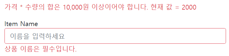 ์คํ๋ง์์ FieldError ๊ฐ์ฒด๋ฅผ ๋ง๋ค๋ฉด ๋ค์๊ณผ ๊ฐ์ด ๋ฉ์์ง๋ฅผ ์์ฑํด๋ฒ๋ฆฐ๋ค.