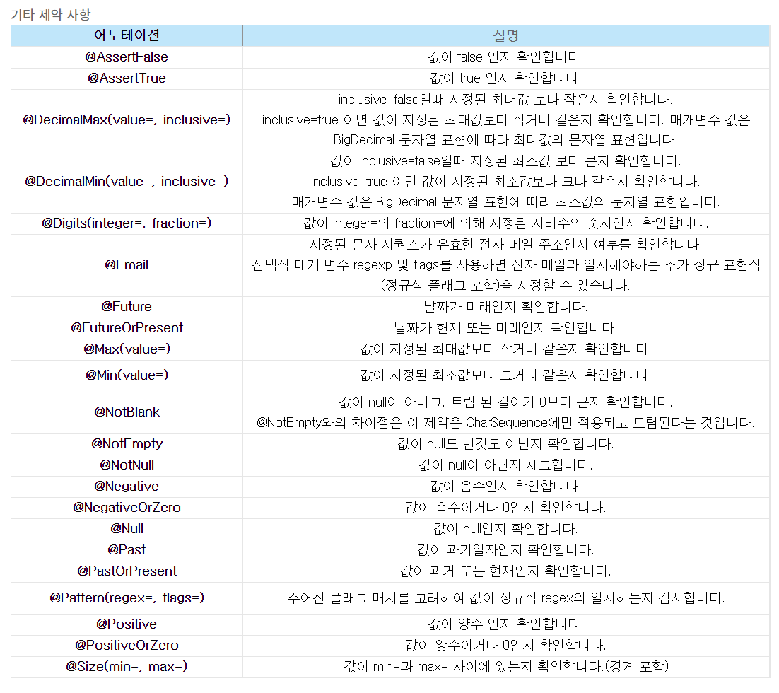 - ๊ฒ์ฆ ์ ๋ ธํ ์ด์ ๋ชจ์: https://docs.jboss.org/hibernate/validator/6.2/reference