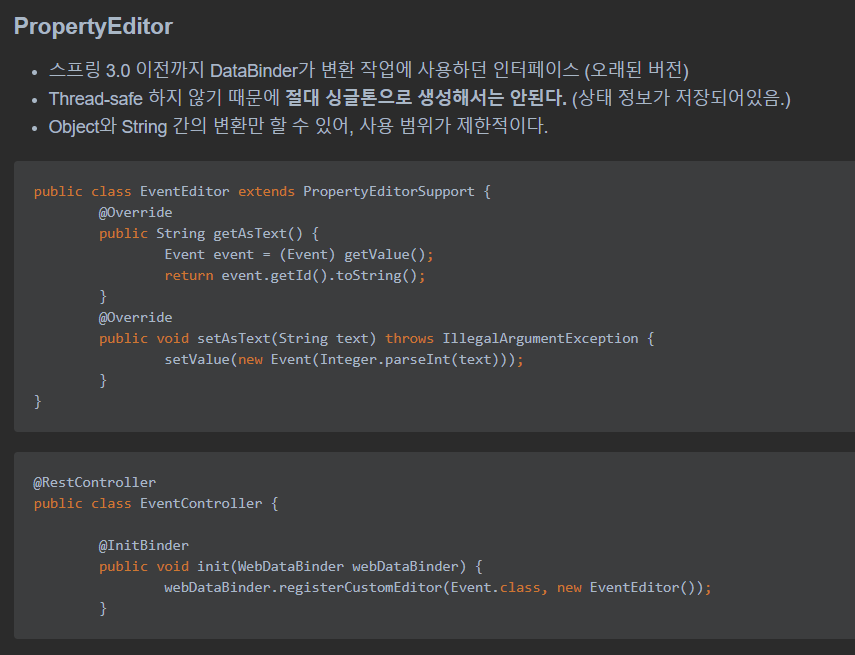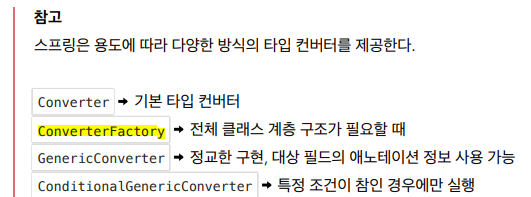 ์ฐธ๊ณ ๋ก ์คํ๋ง3.0 ์ด์ ์๋ ์๋ฐ์ PropertyEditor ๊ฐ์ฒด๋ฅผ ์ฌ์ฉํด ํ์ ๋ณํ์ ํ์๋ค. ํ์ง๋ง ์ด๋ ๋์์ฑ ๋ฌธ์ ๊ฐ ์์ด ํ์ ๋ณํํ ๋ ๋ง๋ค ๊ฐ์ฒด๋ฅผ ๊ณ์ํด์ ์์ฑํด์ค์ผ ํ๋ ๋ฌธ์ ์ ์ด ์์๋ค.