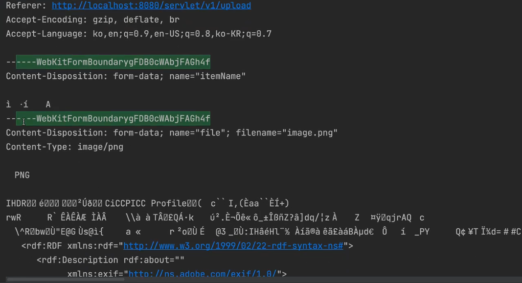 multipart/form-data๋ ๊ตฌ๋ถ์(boundary)๋ฅผ ์ด์ฉํด์ ์ฌ๋ฌ๊ฐ์ง ํ์ ์ ๋ฐ์ดํฐ๋ฅผ ํํธ๋ณ๋ก ๊ตฌ๋ถํ๋ค.