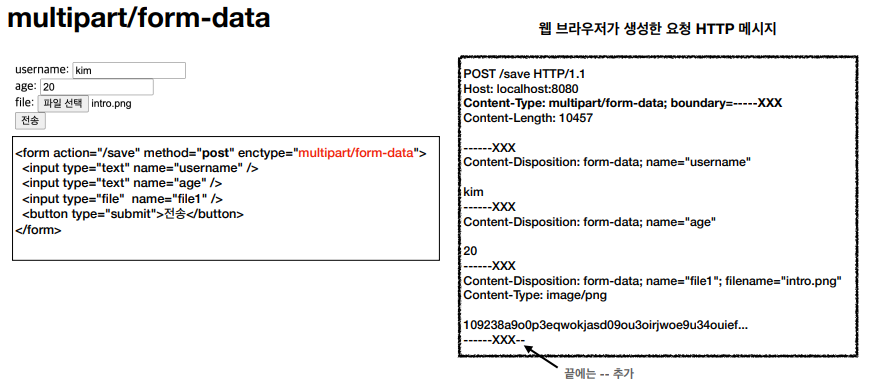<form enctype="multipart/form-data">๋ก ์ธ์ฝ๋ฉ ํ์ ๊ณผ content-type์ ๋ณ๊ฒฝํ ์ ์๋ค.