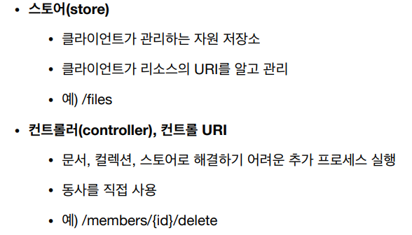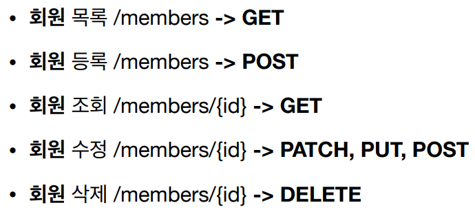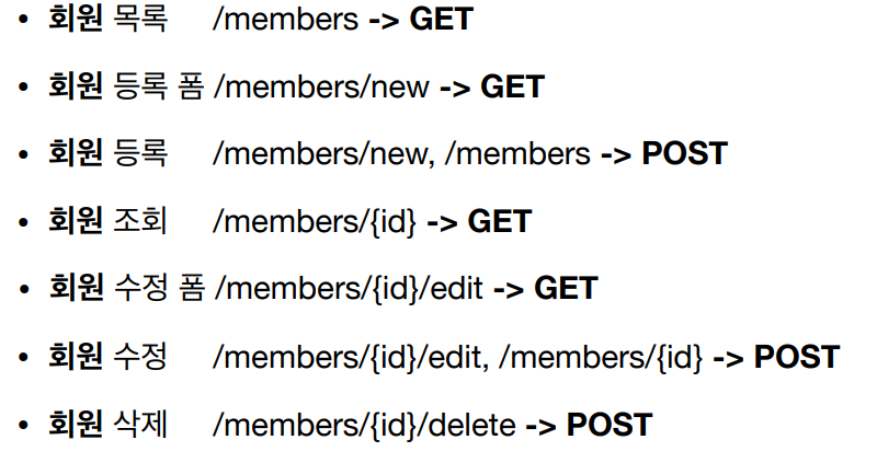 โก ์ด ๊ฒฝ์ฐ ์ต๋ํ GET, POST๋ฅผ ํ์ฉํ๊ณ ๋์ฒด์ฌ๋ก ์ปจํธ๋กค URI( /members/new, delete, edit )์ ์ฌ์ฉํ๋ค.