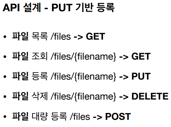 ํ์ผ ๋ฑ๋ก์ PUT์ผ๋ก ์ค๊ณํ๋ ๊ฒ์ด ์ ์ ํ๋ค. ์๋ก์ด ํ์ผ์ด ์ฌ๋ผ์ค๋ฉด ๊ธฐ์กด ํ์ผ์ ๋์ฒดํด์ผ ํ๋๊น.