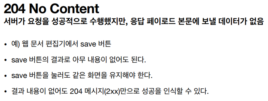 - [204 No Content] ์๋ฒ๊ฐ ์์ฒญ์ ์ฑ๊ณตํ์ง๋ง, ์๋ต ๋ณธ๋ฌธ์ ๋ณด๋ผ ๋ฐ์ดํฐ๊ฐ ์๋ ๊ฒฝ์ฐ ์ฌ์ฉํ๋ค.