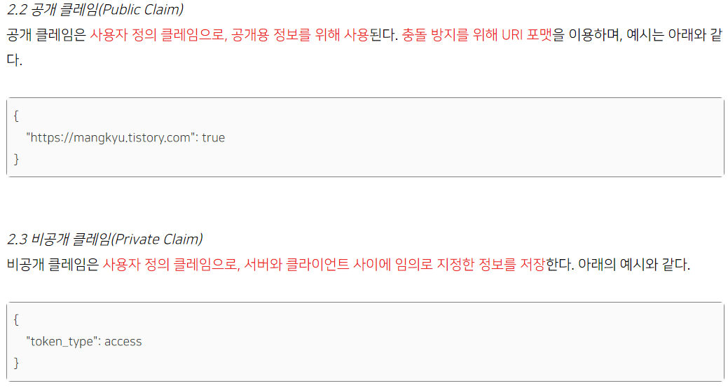 - ํ ํฐ Payload์ ๋ค์ด์๋ ๋ฐ์ดํฐ(Claim)๋ค์ ์๋์ ๊ฐ๋ค.