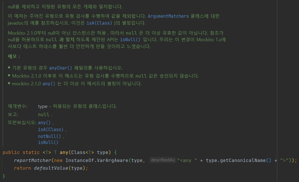 ์๋ฅผ ๋ค์ด AnyInt(), AnyString()์ ํ๋ผ๋ฏธํฐ์ ์ ๋ฌํด์ ํด๋น ํ์ ์ ์ฃผ์์ ๋ ์์ธ๊ฐ ๋ฐ์ํ๋์ง ๊ฒ์ฆ๊ฐ๋ฅํ๋ค.