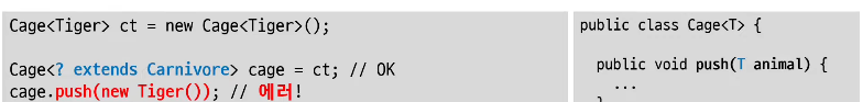 cage.push(new Tiger()); // ์ฌ๊ธฐ์ ์ฐจ์ด๊ฐ ์๋ค. cage.push(T Animal) ์ด ๊ฐ๋ฅํจ.